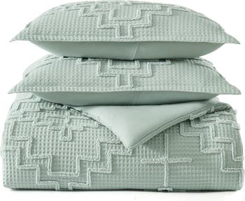 Waffled cotton with tufted, geo-patterned fleece brings rich dimension and texture to this three-piece bedding set, which includes a comforter and two matching pillow shams.