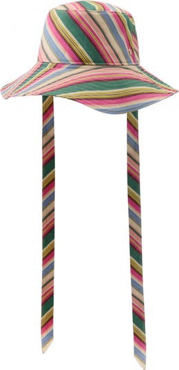 This bucket hat turns sunny-day styling into a standout moment with bold, faded stripes that read playful and graphic. Rendered in organic cotton, it features adjustable tie straps plus UPF protection for coverage you’ll actually want to wear.