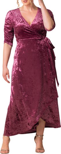 Shine through the upcoming party season in this elegant gown of shimmering crushed velvet in a choice of opulent jewel tones. Ruching along the yoke and sleeves adds a pretty touch to the flattering wrap style while the tulip-cut hem moves gracefully down the carpet.
