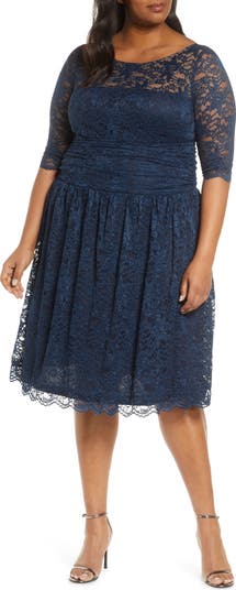 Beguiling sheer details make you feel beautiful and elegant in this shimmery lace dress with a twirly skirt and flattering ruching at the waist.