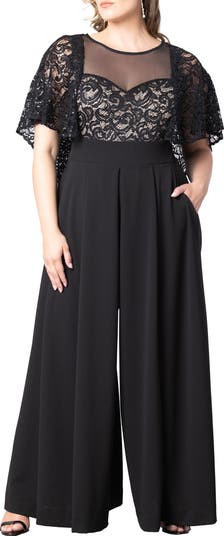 Sparkling sequins add glamour to the lace bodice of this sleek night-out jumpsuit designed with flowy wide legs and a floaty cape at the back.