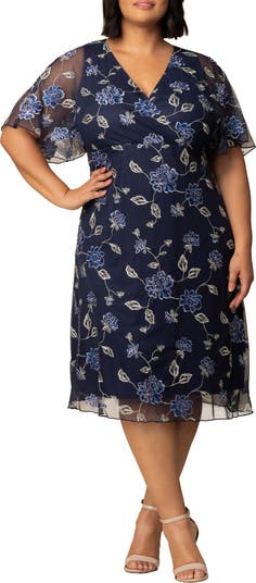 Kiyonna Sonnet Embroidered Midi Dress, Main, color, Navy Blue Blooms