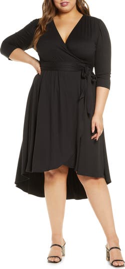 Silky shine and slink are elegantly on point for this wrap dress cut with three-quarter sleeves and a high/low hem.