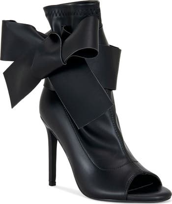 An oversized bow brings statement-making dimension to the ankle of an open-toe bootie lofted by a towering heel.