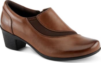 A Lycra® inset adds flexibility to a leather pump that's boosted on a stacked heel.