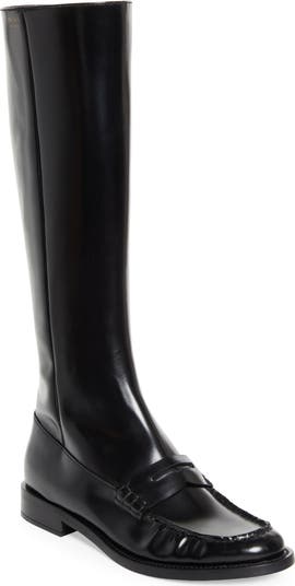 Combining classic prepster style with an equestrian aesthetic, this knee-high riding boot with iconic loafer elements was featured on Prada's fall '25 runway.