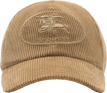 A baseball cap made in Italy from corduroy, featuring a shield-shaped buckle with an antique finish. The style is embroidered with our Knight stamp, an archival motif first seen on Burberry bags in the 1980s.||Adjustable buckle closure|Engraved Burberry lettering at buckle|Embroidered Equestrian Knight Design at front