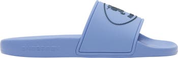 A pair of slides in seasonal cornflower blue, embossed with a contrasting Knight stamp – an archival motif from the 1980s.||Contoured insole|Embossed Burberry lettering at side