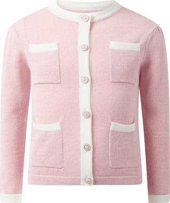 This pale pink knit cardigan is perfect for dressing up any outfit. With four decorative patch pockets and jeweled buttons, it adds a touch of elegance to everyday chic looks or sophisticated formal outfits. Its ivory tipping adds a classic and stylish element, making it a must-have for any wardrobe.