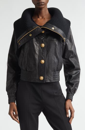 A featured jacket in the maison's resort '26 lookbook, this oversized bomber is made from rich, supple lambskin leather and features wide-gauge rib lining the statement-making spread collar. Signature lion-head crests cover the snaps on the storm placket.