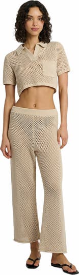The cropped length distinguishes the look of this Knit Crochet Cropped Short Sleeve Polo. It’s made in an openwork cotton knit with a buttonless placket and ribbing at the collar and trims.