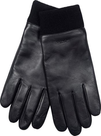 A rib-knit cuff adds textural intrigue and comfort to luxe leather gloves enhanced with signature debossed logos and touchscreen-compatible fingers.