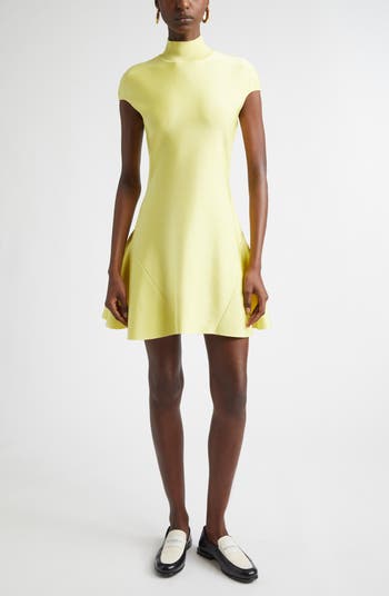 Stand out with the vibrant hue of this knit minidress done in a minimalist silhouette that ends in a flouncy godet-flared skirt.