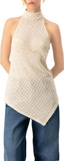 Sleeveless knit top with a halter neck and V-shaped design.