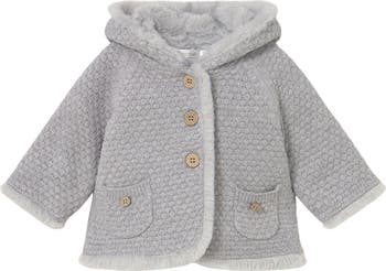 Raglan-sleeve knitted jacket. Features a hood with faux fur details and front button fastening. Soft polyester lining for extra comfort. Functional front pockets.