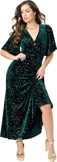 Glide on the dance floor with this fabulous 1970s style knit maxi dress. Featuring a short sleeve silhouette and boasting a deep v-neckline.