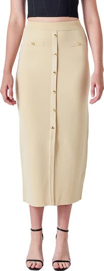 Goldtone hardware and decorative pockets instantly elevate the look of this chic and versatile knit midi skirt.