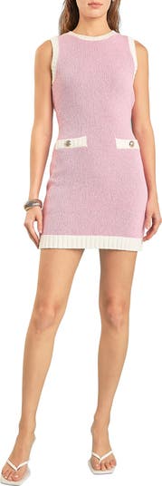 Streamlined welt pockets with goldtone buttons lend a luxe touch to this posh minidress accented by contrasting ribbed trim.