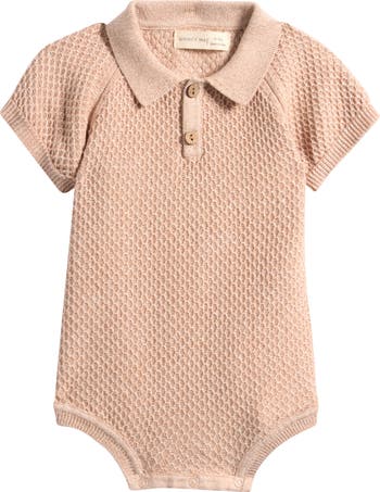 Dapper and practical in equal measure, this one-piece sweater knit from a supersoft blend of organic cotton and linen is topped with a preppy polo collar and equipped with a snap closure between the legs for easy diaper changes.