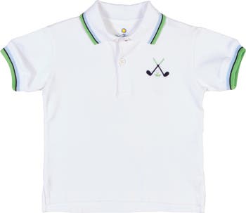 Classic and sporty, this white interlock knit polo is crafted from 100% cotton for soft, breathable comfort. Embroidered golf clubs and a ball add a refined, playful touch, while the white collar and sleeve rib—finished with blue, green, and navy tipping—create a polished, resort-ready look. A traditional button placket completes the design, making it easy to pair with shorts or swim trunks for vacation outings, sunny days, and warm-weather celebrations.