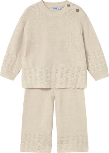 Long sleeved Sweater with round neckline. Buttons fastenings on the shoulder. Decorative elements: decorative openings, braided details. Pants for baby. Elastic waistband. Decorative elements: braided details.