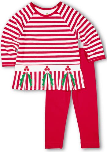 Festive and fun, this two-piece set pairs a red and white yarn-dyed stripe jersey knit tunic with solid red leggings. A three-dimensional appliqué Christmas tree brings playful holiday charm, while a pleated hem ruffle with appliqué holly leaves and a white waist inset with embroidered berries add cheerful seasonal detail. The tunic-length top provides extra coverage with whimsical style, and the ankle-length leggings—crafted from a soft cotton-spandex blend—offer all-day comfort and stretch. Together, they create a picture-perfect look for family portraits, holiday gatherings, and cozy celebrations at home. Red and white yarn-dyed stripe jersey knit top, 97% cotton 3% spandex, red leggings, 3-D appliqué Christmas tree, pleated hem ruffle with appliqué holly leaves, white waist inset with appliqué holly berries, top is tunic length, leggings are ankle length, 2 piece set.