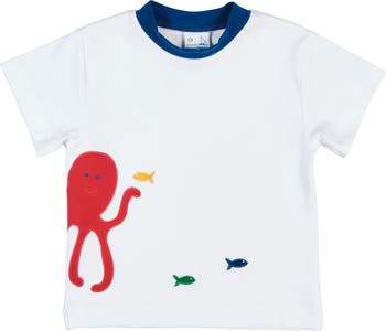 Made for sunny days and seaside play, this white interlock knit shirt is crafted from soft 100% cotton. A cheerful appliqué octopus and fish bring bright, ocean-inspired charm, while a royal blue neck band adds a clean, sporty finish. Easy to pair with shorts or swim trunks, it’s a warm-weather essential perfect for vacations, beach outings, and everyday adventure.