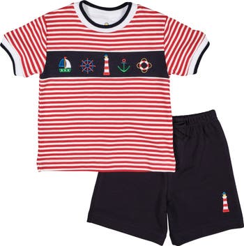 Bold red and white stripes bring a timeless nautical feel to this cheerful knit short set, designed with sunny days in mind. Playful nautical appliqués across the chest and a coordinating lighthouse detail on the shorts add a classic seaside touch. The soft knit top pairs effortlessly with navy shorts featuring an elastic waistband and drawstring for easy movement and comfort. Ribbed trim with subtle contrast tipping offers a polished finish while keeping the look relaxed and wearable. Ideal for summer celebrations, playdates, and warm-weather outings by the water or beyond.