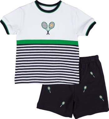 This navy and white striped knit set brings a sweet, sporty feel to springtime dressing. Embroidered heart-shaped tennis rackets add a playful detail that feels classic and fun. The soft top features a buttoned front placket, while coordinating shorts with an elastic waistband and front pockets allow for easy movement and everyday comfort. Designed for play without sacrificing polish. A charming choice for summer fun and warm adventures.