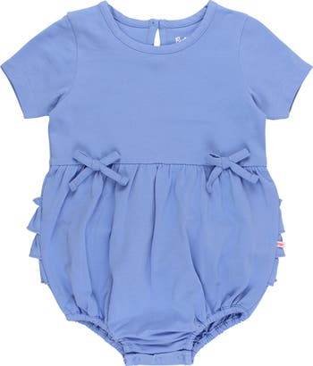 Knit Short Sleeve Bow Bubble Romper is the perfect outfit. This charming girls knit romper features delightful signature rear ruffles and a stylish bow detail that adds a touch of elegance to your baby girl's wardrobe. The romper boasts a keyhole back design with snap closures for easy changing, ensuring convenience for parents and comfort for your little one. Designed with a 4-way stretch fabric, this baby romper allows ample movement, making it ideal for playtime or naptime. The durable fabric not only resists fading and snagging but also maintains its vibrant hue and quality through frequent washes. The bubble romper with snaps offers full seat coverage, combining practicality with fashion.
