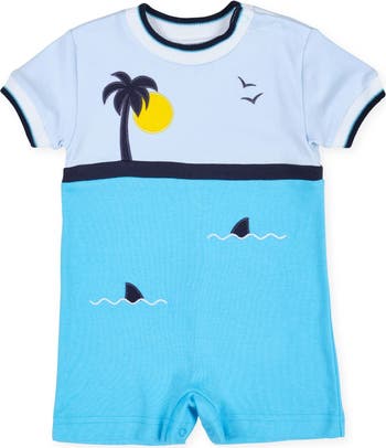 Made for adventures by the sea, this boys' turquoise cotton shortall features an appliqué ocean scene with palm trees, sharks, and seagulls, complete with white neck and sleeve ribbing. Convenient shoulder and inseam snaps ensure quick dressing.