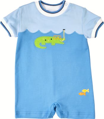 Soft shades of blue set the scene for this playful knit shortall, featuring a cheerful alligator appliqué on an underwater adventure. A surprise fish detail at the back adds extra charm. Designed with shoulder and inseam snaps for easy changes, this shortall allows for comfortable movement and all-day wear. Thoughtful trim details keep the look polished yet fun.¬†Perfect for spring and summer outings and sunny days filled with imagination.