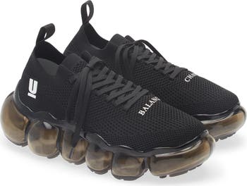 Jun Takahashi brings his celebration of the underground to the forefront in a mesh-stitch knit sneaker that puts a declaration of chaos counteracted with balance on the mismatched pair. Clear bubble pods along the sole bring a futuristic look, while ribbon pull-tabs make it easy to slip on and go.