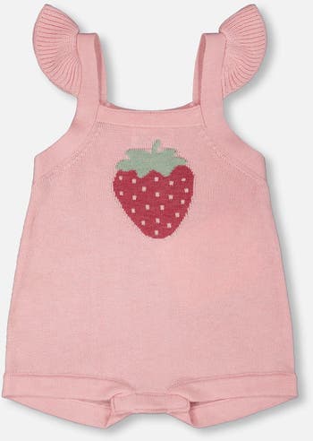 A big fruity motif makes the knit strawberry romper in light pink a playful favorite for little girls. This sleeveless bodysuit is designed with ruffled straps, a printed strawberry on the chest, elasticized leg openings, and snap closures at the bottom for easy changes. Knitted from a soft blend of polyester, nylon, acrylic, and wool, the fabric is cozy yet lightweight, offering comfort for cool summer evenings or breezy spring days. A whimsical piece from our "Blueberry Cuddles" collection that adds sweetness to any outing.