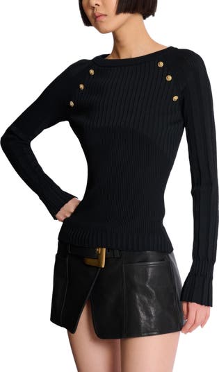 Openwork knit top Boat neckline Long raglan sleeves Mixed knit 'Lion Head' buttons Fitted cut Model measures 175cm and wears a size 36 Main material: 75% viscose 25% polyester Made in France Item: GF1ARA60KJ45 100% of the viscose fibres used to make this garment come from certified, sustainably managed forests