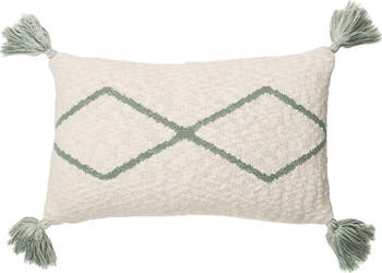 Knitted Cushion with Rhombs Pattern, in Natural base color with rhombs in Indus Blue, Grey, or Pale Pink. Each cushion features small tassels on the corners, a 100% soft knitted cotton cover with zipper, and a removable polyfill cushion for easy care and comfort.
