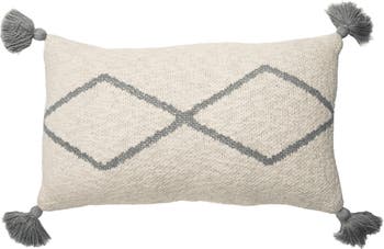 Knitted Cushion with Rhombs Pattern, in Natural base color with rhombs in Indus Blue, Grey, or Pale Pink. Each cushion features small tassels on the corners, a 100% soft knitted cotton cover with zipper, and a removable polyfill cushion for easy care and comfort.