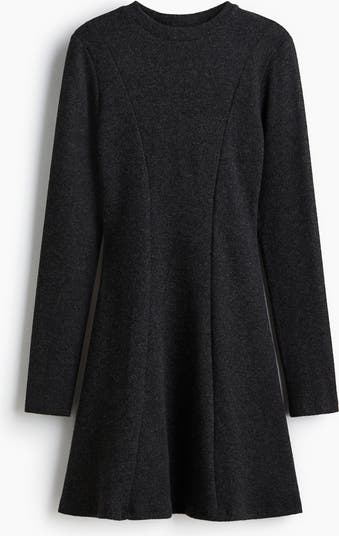 Long-sleeved mini dress in a soft, fine knit with a round neckline. Visible seams down the front, shaping darts at the back and a flared skirt.