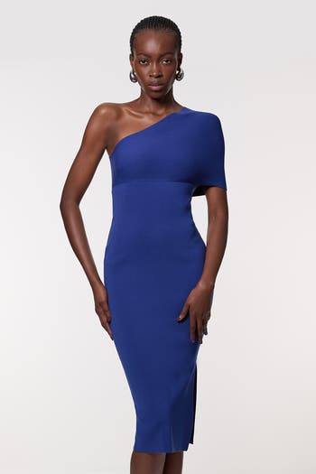 Striking one-shoulder design for a contemporary silhouette. Compact rib stitch knit fabric offers a sleek, figure-hugging fit. Mid-length cut hitting below the knee for versatile styling. Short sleeve on the shoulder adds a touch of asymmetry. Seamless construction for a smooth, streamlined appearance. This Karen Millen Compact Rib Stitch Knitted One Shoulder Dress is a masterclass in modern elegance.