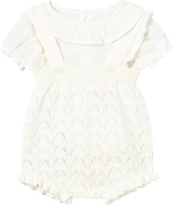 An elegant romper crafted with delicate knitwork, perfect for special occasions. The soft fabric, chevron pattern, and ruffled details bring a vintage-inspired charm while ensuring comfort for little ones.
