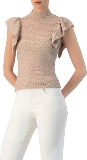 Straight-cut knitted blouse with a high neck and ruffle sleeves