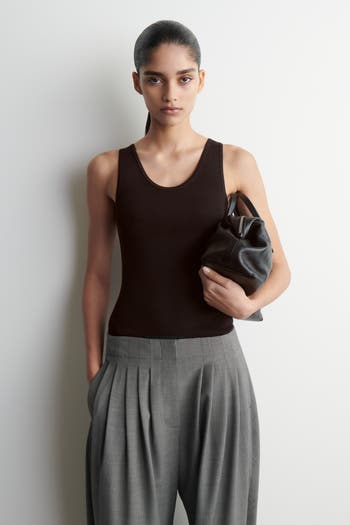 The classic tank top is a foundation of the daily wardrobe. Cut in a slim shape, this knitted piece comes in a rich chocolate tone that offers dynamic styling potential. The scoop neck is finished with tubular edges, while the fashioned side seams lead to a split hem.