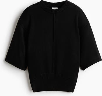 Knitted top with a linked seam down the front, dropped shoulders and short sleeves. Ribbing around the neckline and at the cuffs and hem.