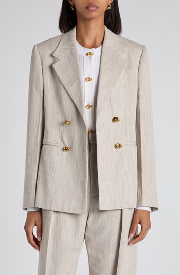 Gleaming knot-shaped buttons brings signature BV flair to this open-front blazer impeccably tailored from a textured silk-enriched blend shaded with subtle stripes.