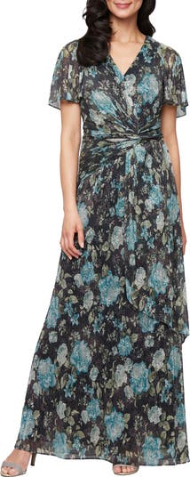 A stunning floral print is enhanced by a lustrous metallic shimmer on this ankle-grazing gown fashioned with fluttery sleeves and a knotted accent along the bodice.