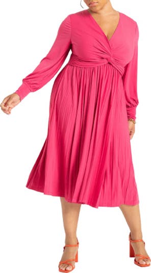 This dress combines a close-fit bodice with a pleated skirt, made from stretch knit matte jersey, ideal for below-knee length styling with a twist detail at the waist.