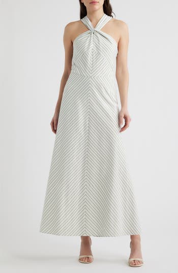 Crisp stripes and a breezy cotton construction define this effortlessly polished halter midi dress. Designed with a paneled bodice for a flattering, structured fit, it features a knotted detail at the neck that adds subtle dimension. The silhouette flows into an easy A-line skirt, creating movement and a clean, elongated shape.