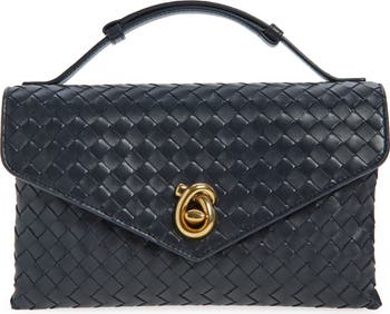 Gleaming knot hardware encircles the turnlock closure on a compact shoulder bag woven from richly grained Italian leather using the label's iconic intrecciato technique.