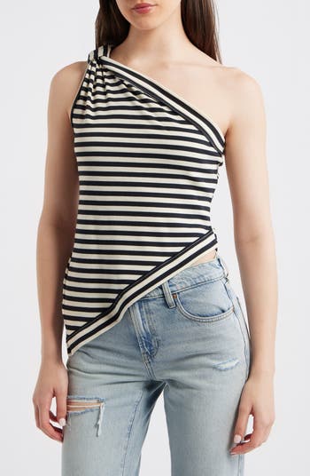 A simple knot updates this striped top made with an asymmetric silhouette that bares one shoulder and features a pointed hem.