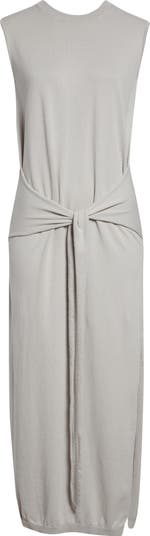 Knit from a fine cotton crepe yarn, this lightweight sweater-dress is fashioned with attached ties that knot in front to shape the hips and provide definition to the minimalist style.